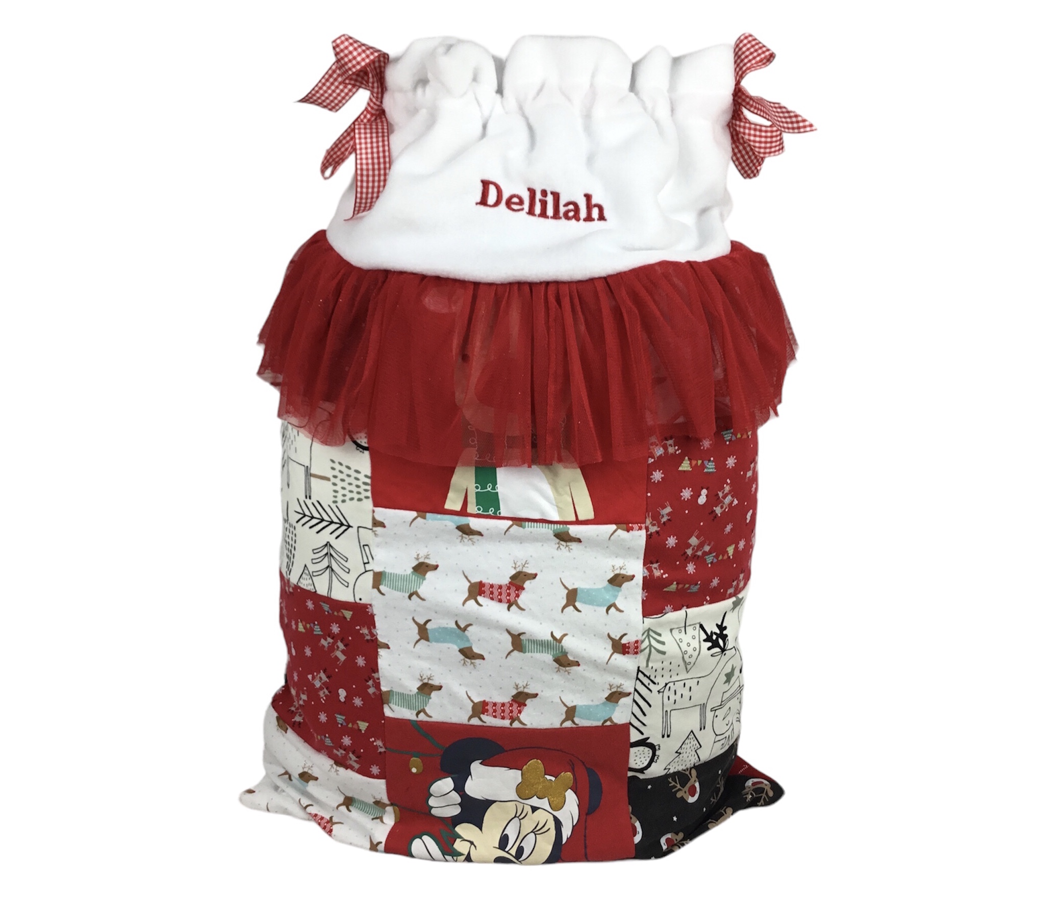 Your unique Xmas Sack is finished with a beautiful red check coloured ribbon drawstring to tie the top.