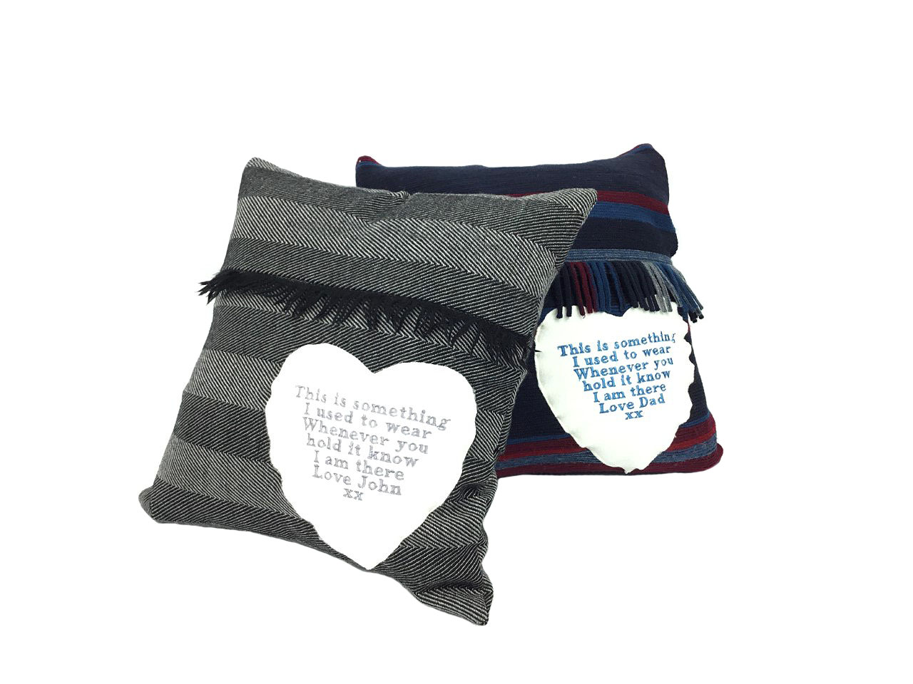 Memory Cushions are created from adult clothing such as shirts, jumper, cardigan, jacket, coat, dress, skirt, nightie, P.J’s, top, blouse, scarf, ties or any special material belonging to your loved one.