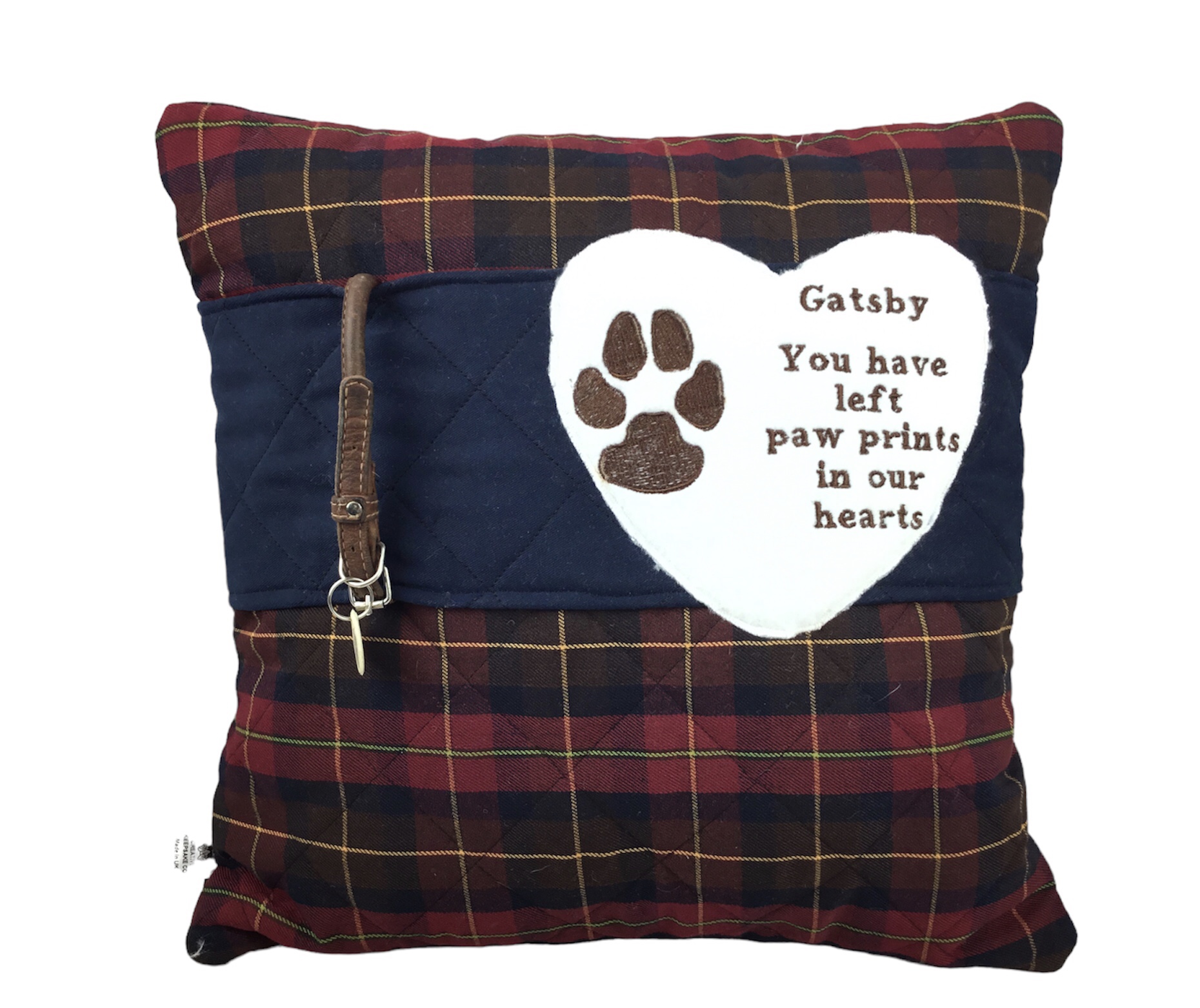 Our Pet Memory Cushion Keepsake gives you the opportunity to include your pet’s collar. Be sure to let me know if you would like to add your pet’s collar so a slot will be added for collar.