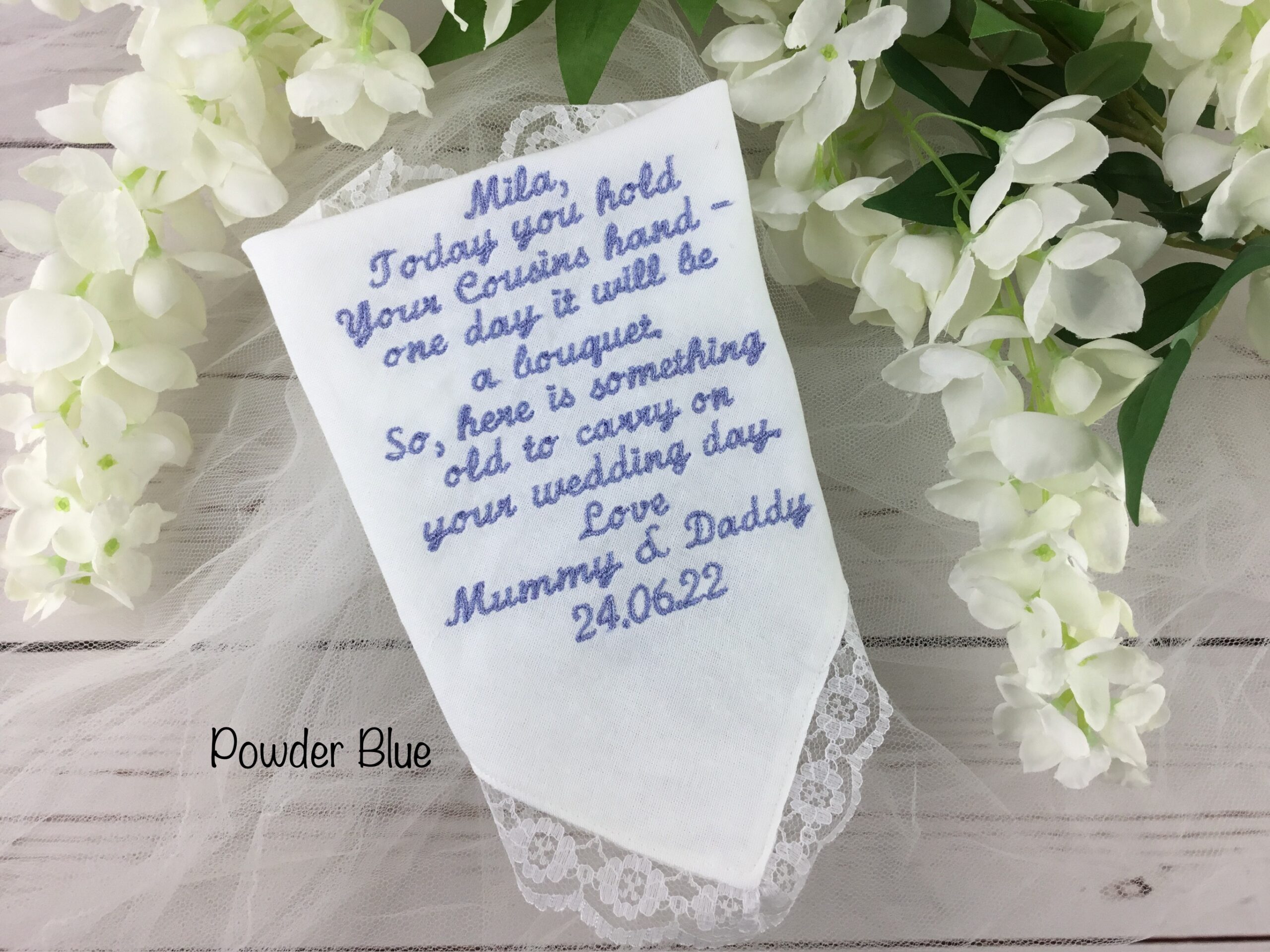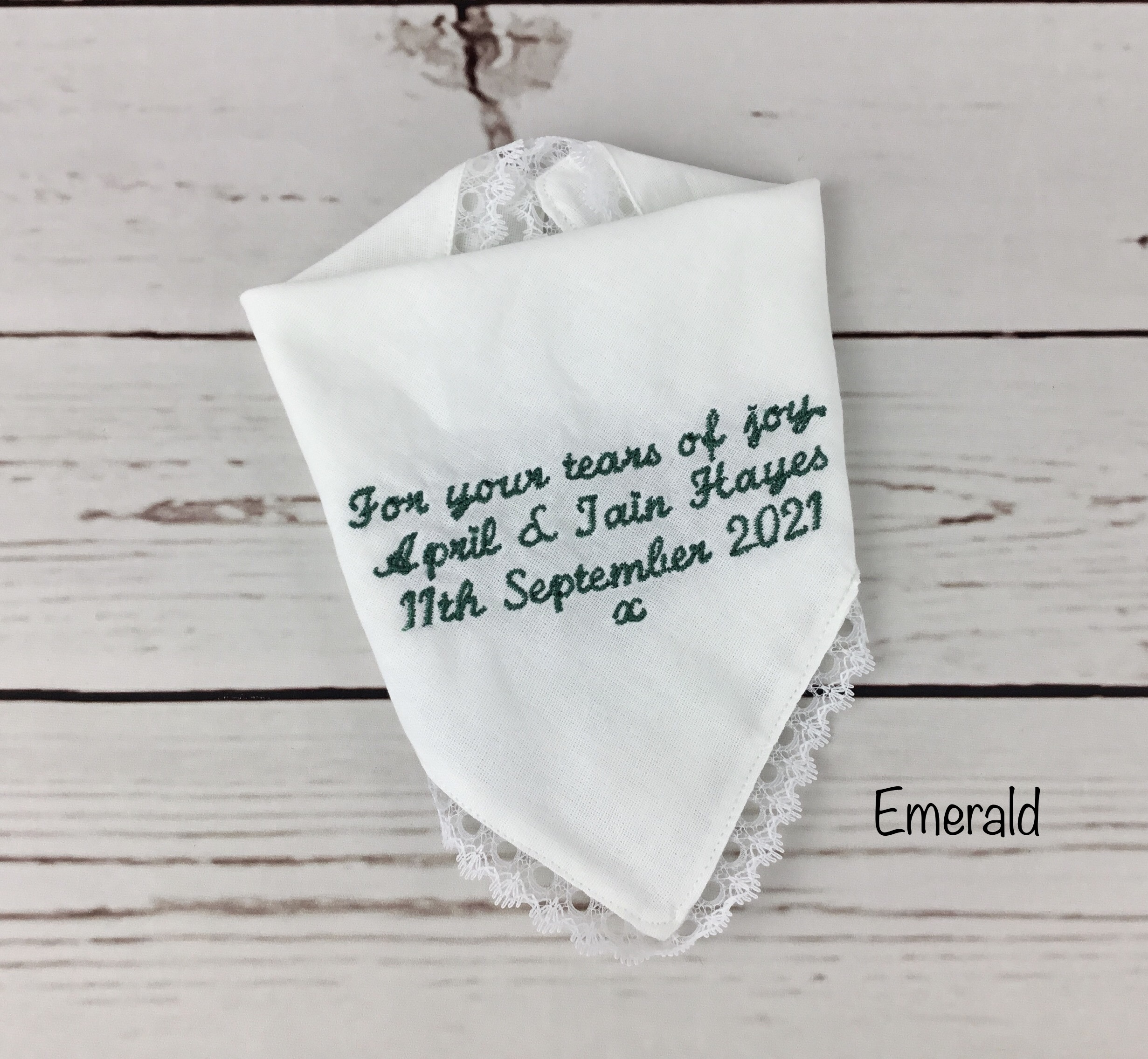 Order your Handkerchief and select colour of embroidery. Add your personalisation for E.g. Verse/name/date