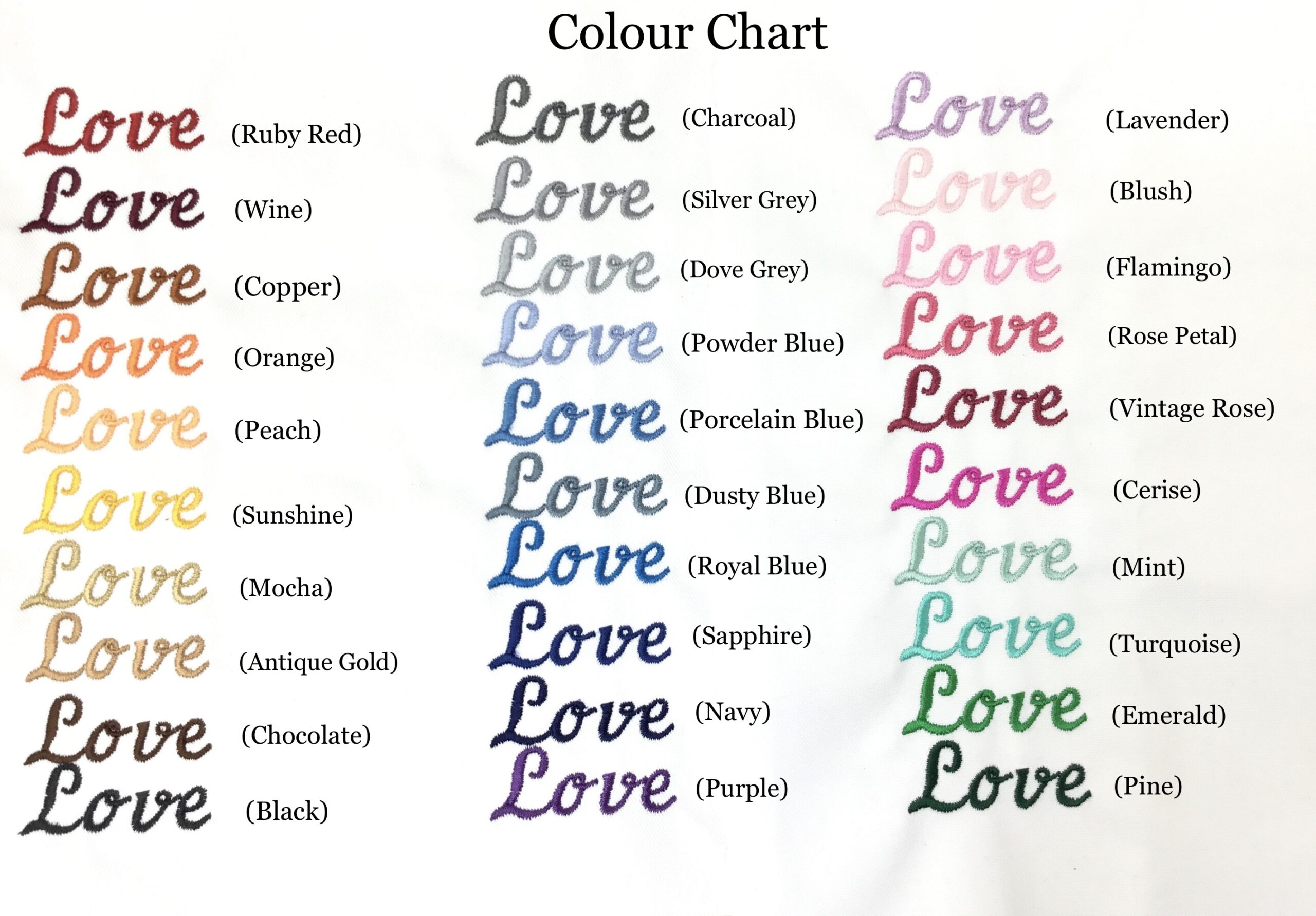 If you have any questions or special requests or if you would like a different colour to match you wedding theme for embroidered characters not listed please feel free to contact me.