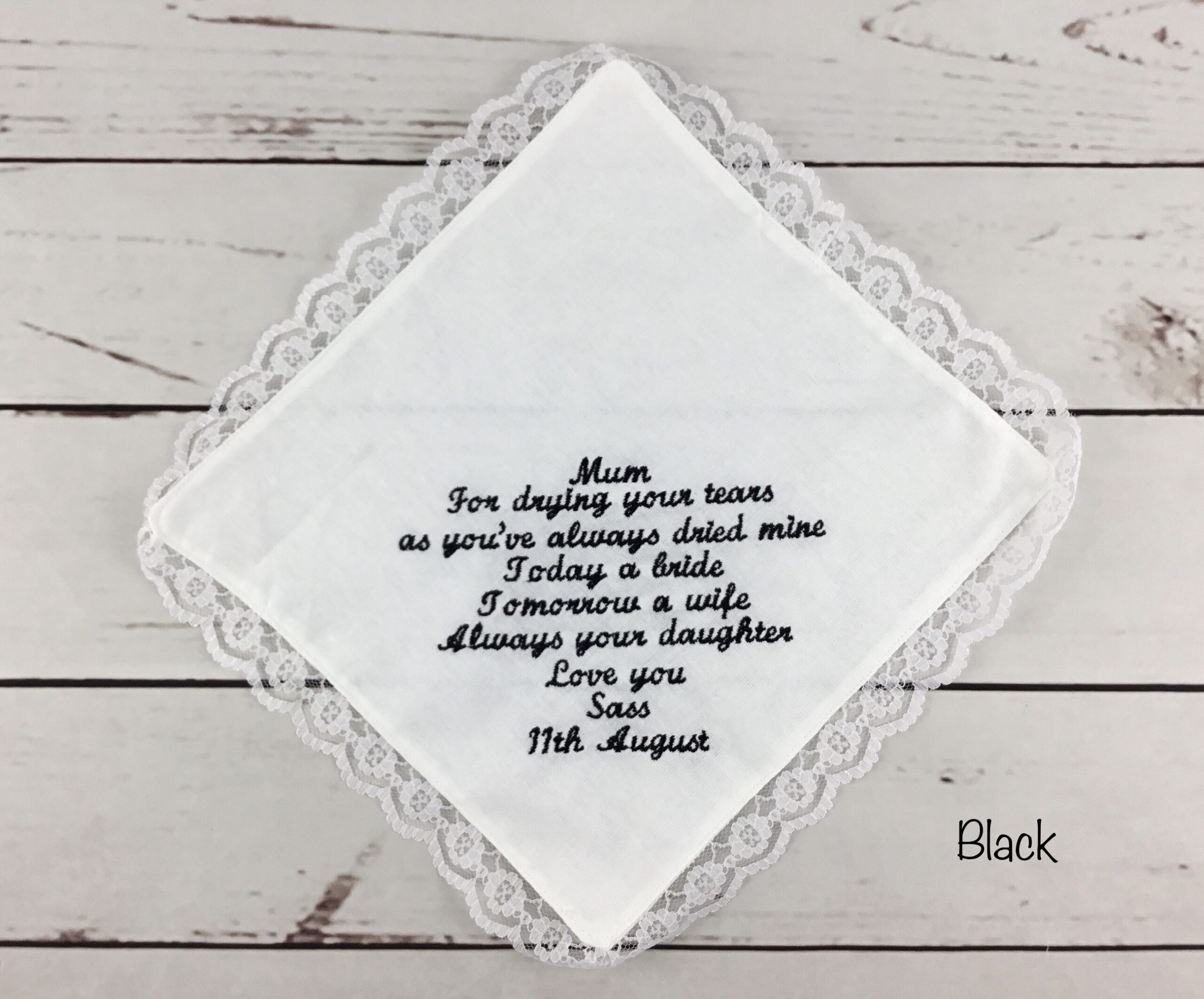 Our personalised wedding Hankie can also be given to the mother of the bride or groom, father of bride or groom, granny, sister, bridesmaids, aunty, friend, as a thoughtful gift to remember this special day.