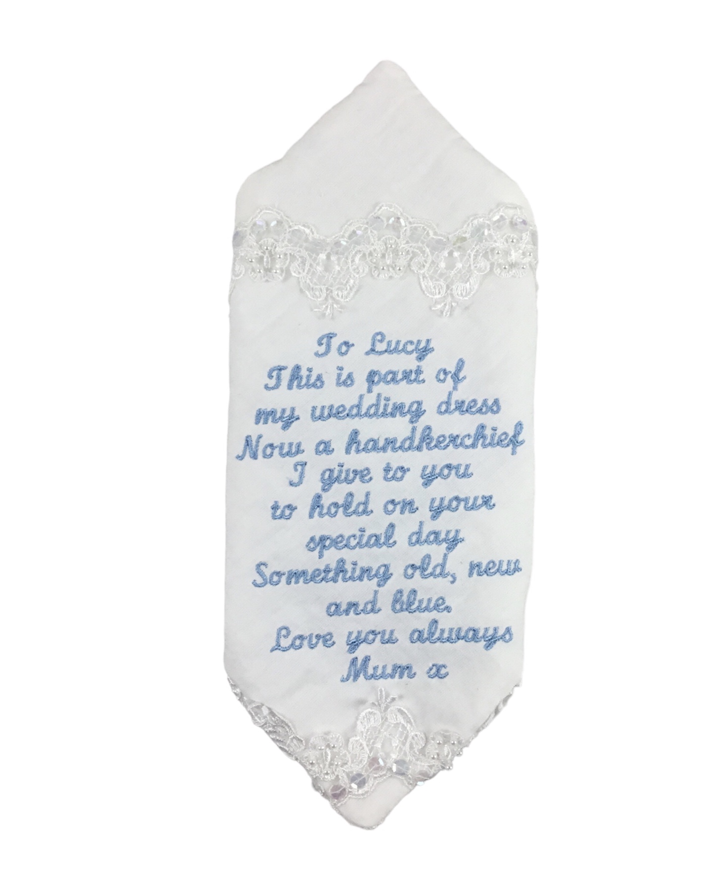 Order your Handkerchief and select colour of embroidery. Add your personalisation for E.g. Verse/name/date